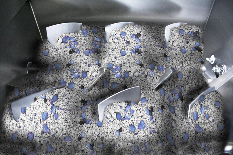 Mixing followed by synchronous spray-coating and drying in the Pegasus® Mixer is a technique that until now has been mainly used for adding essential ingredients to bulk solids, such as aromas, oils, vitamins and solvents. The special metering unit in the Pegasus® Mixer sprays exactly the right amount of fluid into the mixer. The unique properties of the fluidised zone cause the finely atomised fluid droplets to mix homogenously with the other ingredients in the machine. The result is that each product particle is completely encapsulated by the fluid. The product particles are then dried in a jet of hot air. This process of mixing and synchronous spray-coating and drying in the Pegasus® Mixer is mainly used for applications where rapid, efficient and homogeneous production is required. Intermediate drying steps allow multiple coats or large quantities of fluids to be sprayed onto the bulk solids. Powders, granules and granulates cannot form lumps or get damaged in the fluidised zone. Furthermore, simultaneously performing three process steps in a single compact unit saves energy and delivers other cost savings, as the process components can be cleaned rapidly and thoroughly with a minimum of effort.