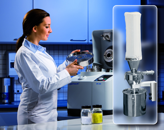 For applications which require an optimum air throughput (e. g. heat sensitive materials) or if larger sample volumes need to be processed, the use of a cyclone is recommended. RETSCH offers a re-designed cyclone with improved functionalities for collector volumes from 250 ml to 5 liters which adds to the ZM 200’s great flexibility.
