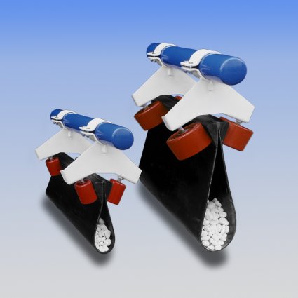 This system is a belt conveyor which totally encloses the transported product by folding the belt around the product. This belt is closed the whole route, also on the return part. Advantages of this system is that it results in dust and spillage free transport.