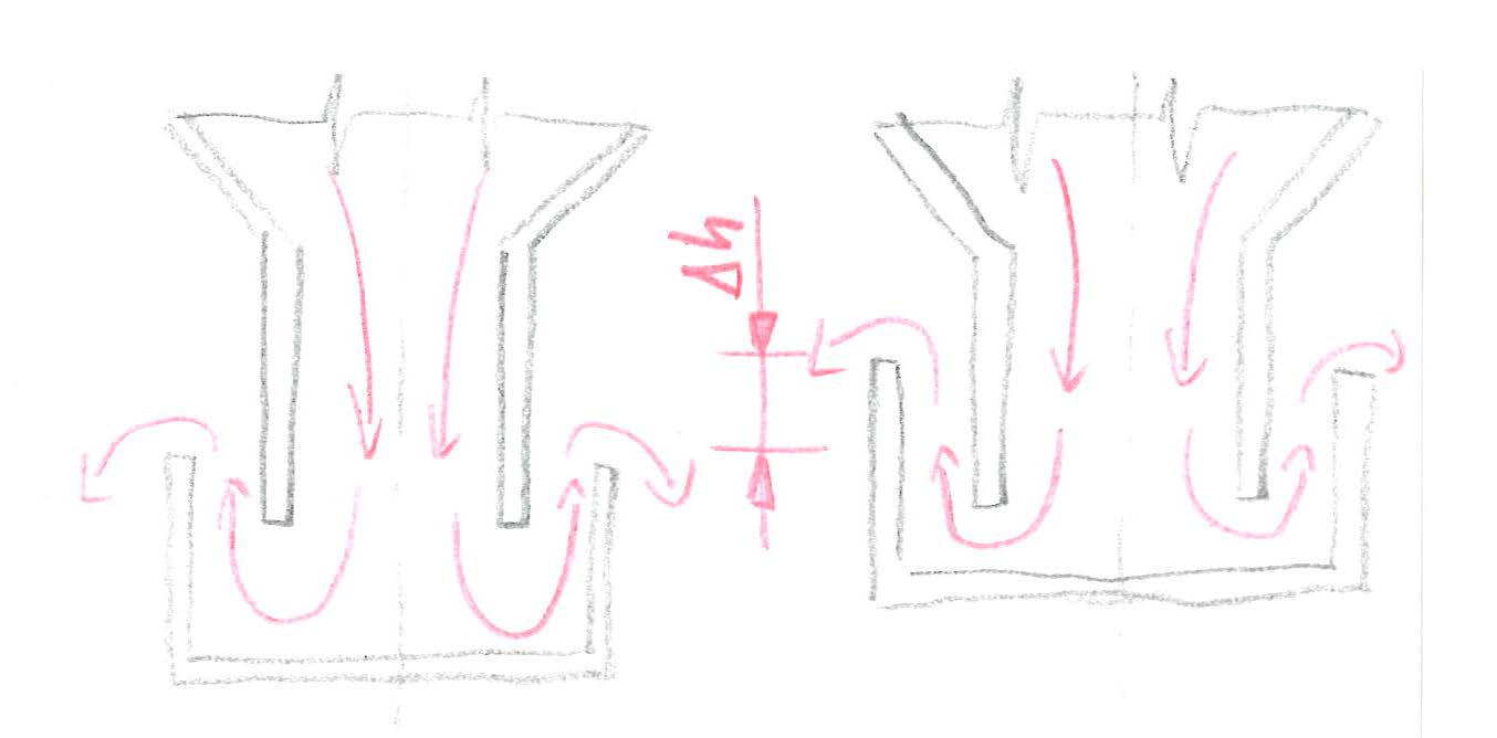This is not the Mexican Hat (MH) design. The principle of the MH is to regulate the flow stream starting from the rear of the feeder and to somewhat force mass flow by causing internal obstructions between selected cross-flow partitions. The opening under each partition is increasingly graduated in height from the first to last. The difference in partition heights controls the mass flow over the respective partition in proportion to the overall height difference between first and last partition = exit height.