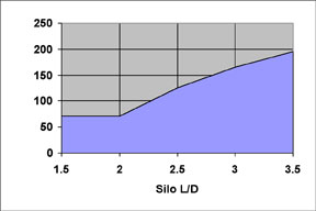 When the L/D of the silo becomes greater than 2 the vent relief area significantly increases. In many cases the vent area will more than double for L/Ds of less than 3 compared to a L/D of 2 as shown in Figure 2 below. For a specific silo volume capacity if you can design the silo diameter to be larger (the length will decrease), then the vent area requirement will decrease significantly.
