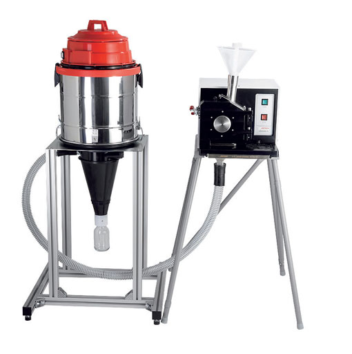 If a sieving of 0,5 mm is desired, then most materials can only be prepared with a combination of the cutting mill with the cyclone separator. The cyclone separator generates an air current. It downright draws the materials from the funnel, and acts as a coolant during the comminution and fosters the movement of the material and therefore the passing through the sieve. The finished prepared sample is removed through the cyclone separator into a sample glass.