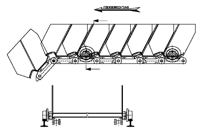 Figure 1 shows the longitudinal and cross section of the apron style steel pan conveyor system SZB 250 where the basic configuration and functioning can be seen. (Foerderrichtung = Conveying directio