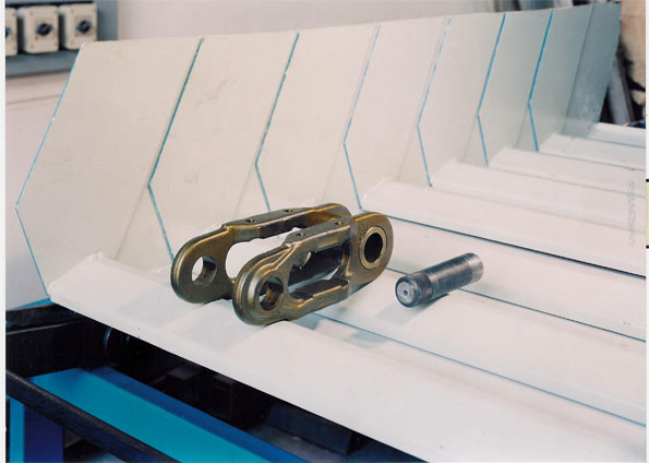 For the apron style steel pan conveyor SZB 250 the belt pans as shown in Figure 3 are self-supporting and therefore it is not necessary to support them via the chain by means of cams and lugs. This has a positive effect on the service life of the chain.