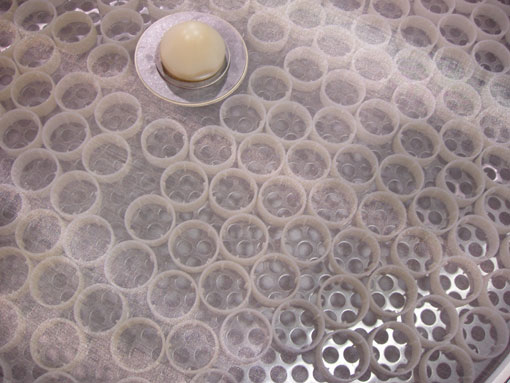 Fig. 2: Sliders travel across the top of a perforated plate. The motion of the vibratory separator throws the sliders into the screen as they rotate around the center of the machine.