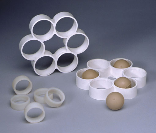 Fig. 3: shows single slider rings lower left, slider clusters center top, and rubber balls on the lower right.